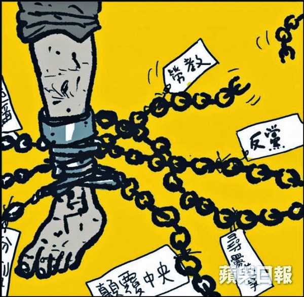 In more serious news, the National People’s Congress has voted to end re-education through labor (laojiao). Current prisoners, who have often been detained and sent to labor camps without trial, will be freed immediately, but “penalties imposed before the system was abolished will remain ‘valid,’” the Sydney Morning Herald reports. In this cartoon, the chain on the shackle of laojiao is broken, but “subversion of the central government” (颠覆中央), “opposition to the Party” (反党), and other “crimes” remain their grip. (Zunzi/Apple Daily)