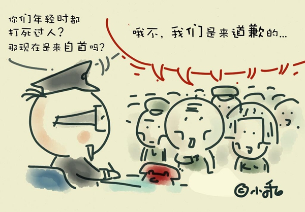 Police officer: You all beat people to death when you were young? So now you’re turning yourselves in?