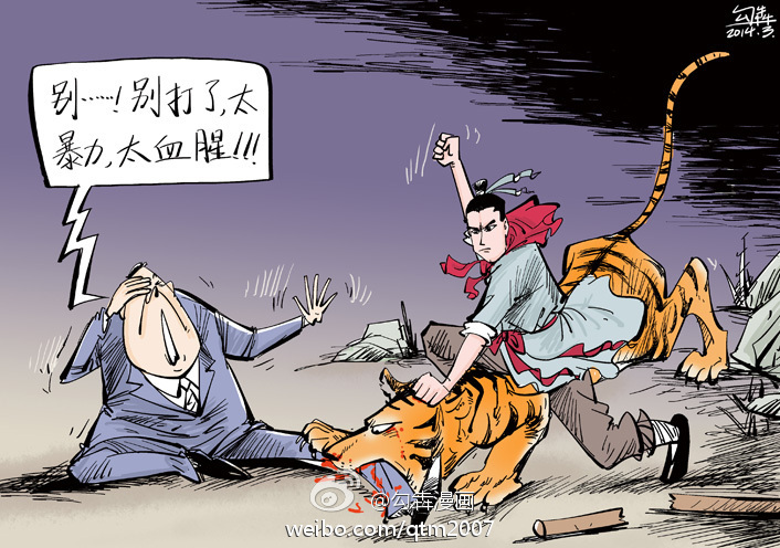 - “Stop! Don’t hit him! Oh, the humanity!” In the story from the classic novel Water Margin, Wu Song beats a tiger to death with his bare hands. But in Xi Jinping’s modern strike against “tigers”–corrupt officials high up in the Party–lesser cadres are feeling the bite, too. Three local officials in Hunan recently told the AP about their torture in the internal disciplinary system known as shuanggui. One of the officials, Zhou Wangyan, was starved, deprived of sleep, and had his leg broken before he finally “confessed” to accepting bribes. (Gouben/Weibo)