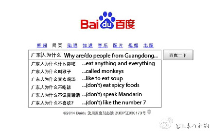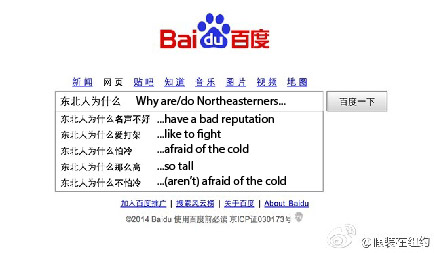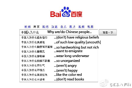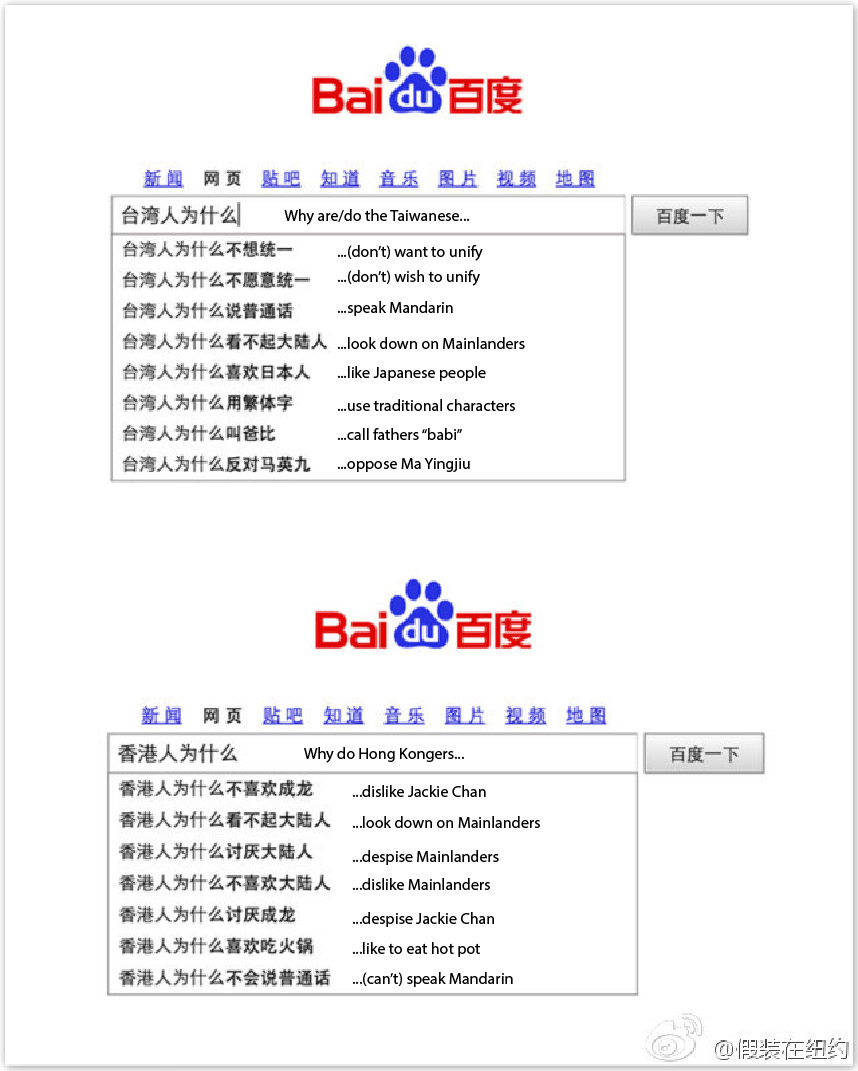 Weibo user 假装在纽约 allowed Baidu to finish questions beginning “why are people from [insert region]…” [[XX]人为什么…], providing a glimpse of the stereotypes attributed to individuals from different regions in China. CDT has translated 假装在纽约’s findings and his weibo conclusion:
