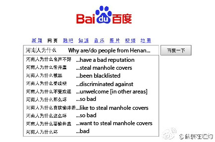 Why is the northwestern Chinese region of Xinjiang “so chaotic?” Why are many from the southern metropolis of Shanghai “unfit to lead”? And do people from central Henan Province really steal manhole covers? These are just some of the questions — ranging from the provocative, to the offensive, to the downright ridiculous — that Chinese people ask about themselves and each other on Baidu, the country’s top search engine, which says it processes about 5 billion queries each day.