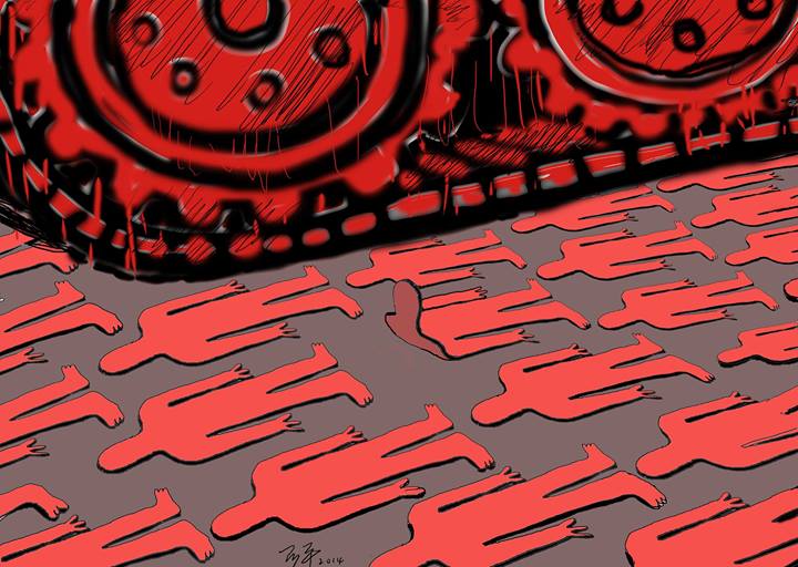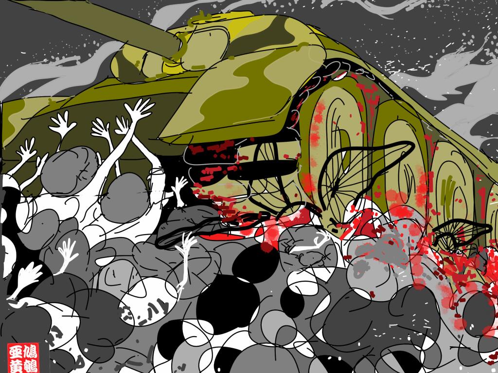 - Even as they are crushed, protesters pull apart the tank. (Jiu’an 鳩鵪)