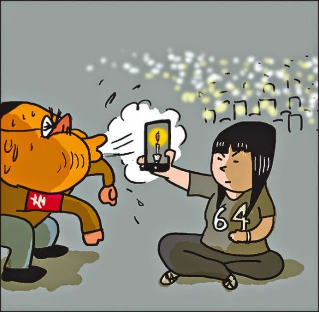- No amount of air will blow out this protester’s digital flame. Her shirt is emblazoned with the numbers six and four, standing for June 4th. (Zunzi 尊子)