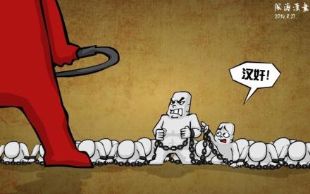 - Cartoonist Rebel Pepper himself became the subject of recent headlines. After publishing a cartoon mocking pro-Beijing protesters in Hong Kong, state media launched a smear campaign that drew attention to sympathetic social media comments the cartoonist had made about his time in Japan—the campaign began on a People’s Daily BBS, where a user labeled the outspoken cartoonist a “traitor.” Currently in Japan, Pepper told Radio Free Asia that he feared detention upon returning to mainland China. In the cartoon above, one of many shackled minions calls the unchained Pepper a “traitor.” (Chengtao 成涛漫画)