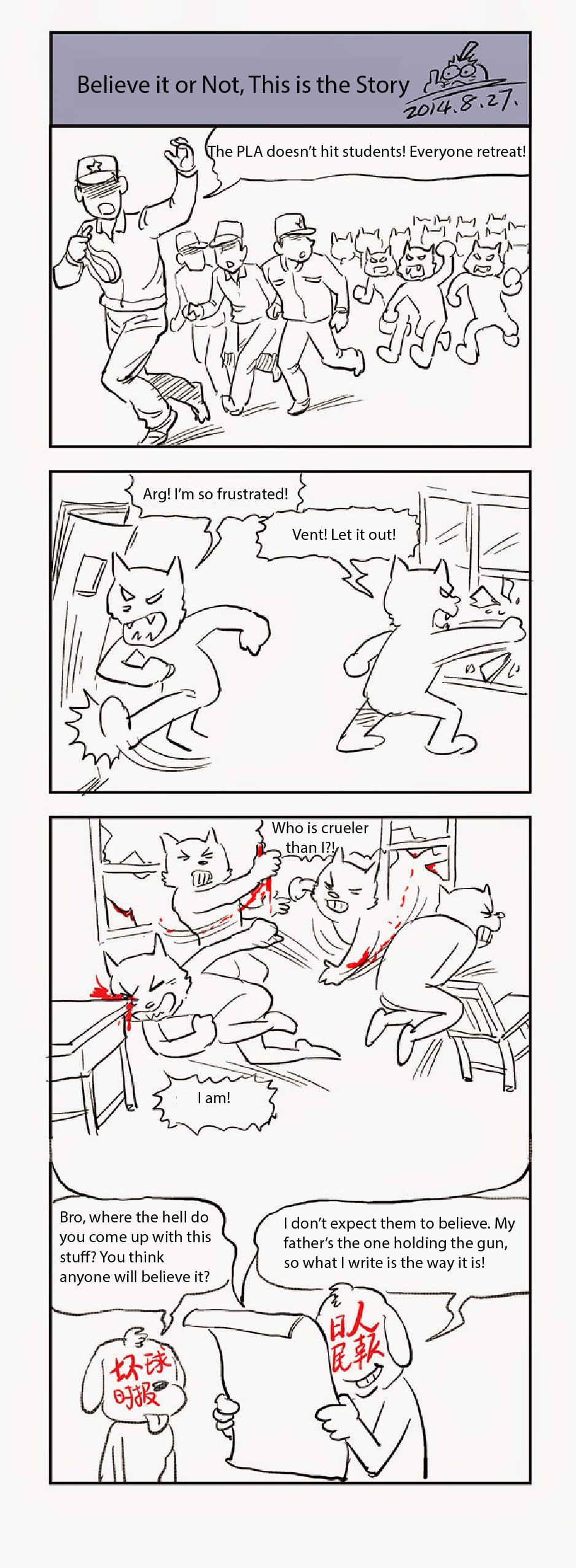 - While the junxun incident led some web users to express anger towards widespread corruption in the military, others thought that students’ disobedience was the issue on display. This cartoon from Rebel Pepper shows state media construing their version of the Hunan brawl. The dogs on the bottom are labeled Global Times (left) and Screwing People Post (right). (Rebel Pepper 变态辣椒)