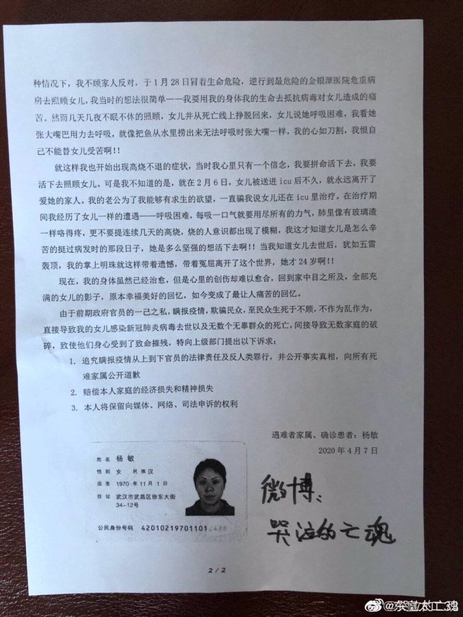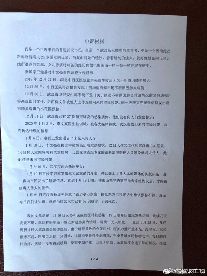 Due to the selfish actions of government officials at the beginning of the epidemic, the truth was concealed and the public was deceived. They disregarded the life and death of the populace, and sowed chaos with their malfeasance. Their actions directly led to my daughter’s death from coronavirus infection, and the deaths of countless innocent people. They indirectly caused the rupture of countless families, devastating them physically and mentally. I here make a special request to the higher authorities:
