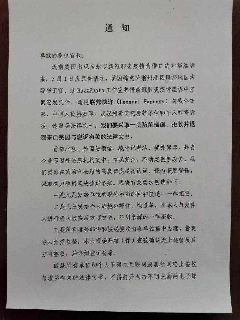 There have recently been a surge of American lawsuits against China based on the pretext of the novel coronavirus epidemic situation. On May 1, a U.S. District Court of the Northern District of Texas officially issued related legal documents, pertaining to BuzzPhoto Studio and other plaintiffs, and via Federal Express mailed relevant legal documents such as complaints and subpoenas to our Ministry of Foreign Affairs, the People’s Liberation Army, the Wuhan Virus Research Institute, as well as to other work units and individuals. We will take all possible preventative measures to reject and return legal documents related to these frivolous lawsuits from the United States.