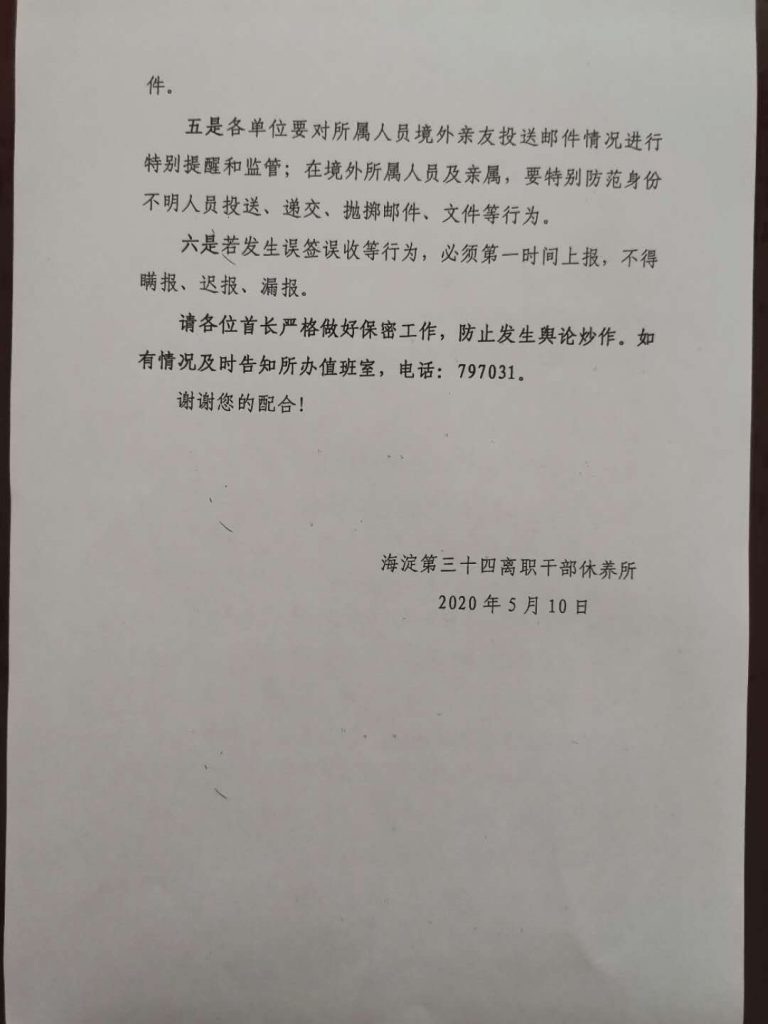 CDT Chinese last week reported on a notice issued by a rest home for retired officials that has been circulating online. Dated May 10, the notice asked “we will take all possible preventative measures to reject and return legal documents related to these frivolous lawsuits originating from the United States.”