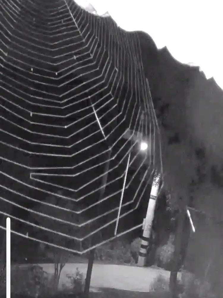 At 11:00 p.m. a spider starts to spin a web. The spider looks silvery white on camera. Its oval belly appears for a few seconds, then disappears. It hasn’t gone far, though—it’s just weaving at the periphery. An hour later, the web is done, but it’s too close to the camera to be fully visible. The clever spider chose its territory wisely, positioning its web in front of the surveillance camera: a web atop a web. At night, the camera emits a dark red light, attracting flying insects. Around 1:00 a.m., an insect gets trapped in the web. It flaps around, struggling to escape, but the spider quickly pounces on it, then scurries away again.