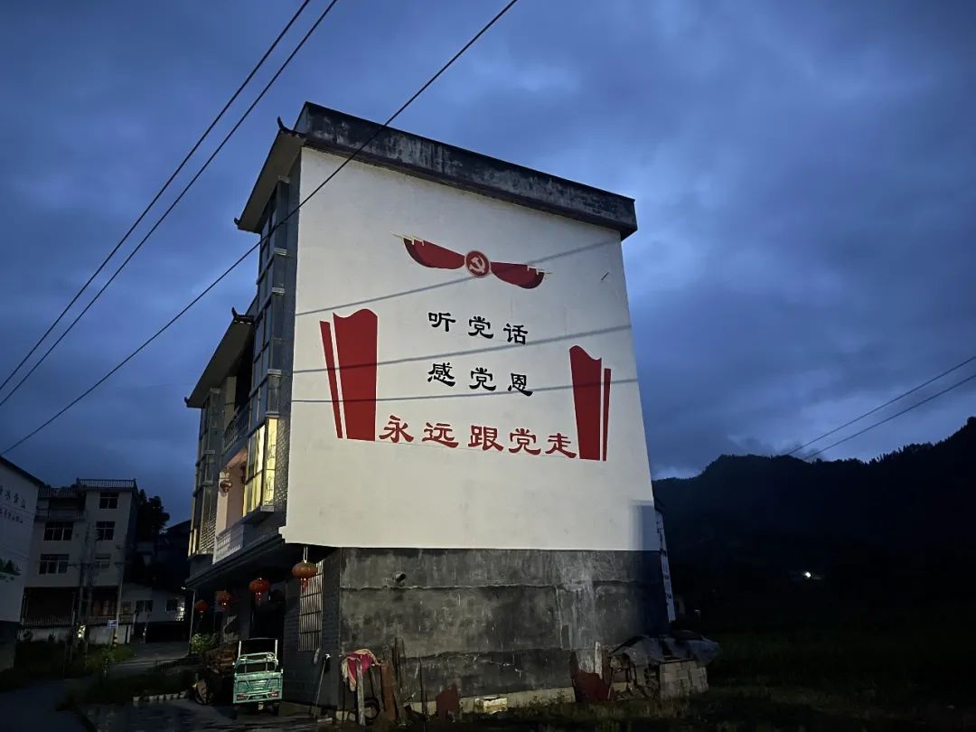 An enormous slogan painted in red and black Chinese characters on the side of a building reads: “Listen to the Party, be grateful to the Party, and always follow the Party’s lead.”