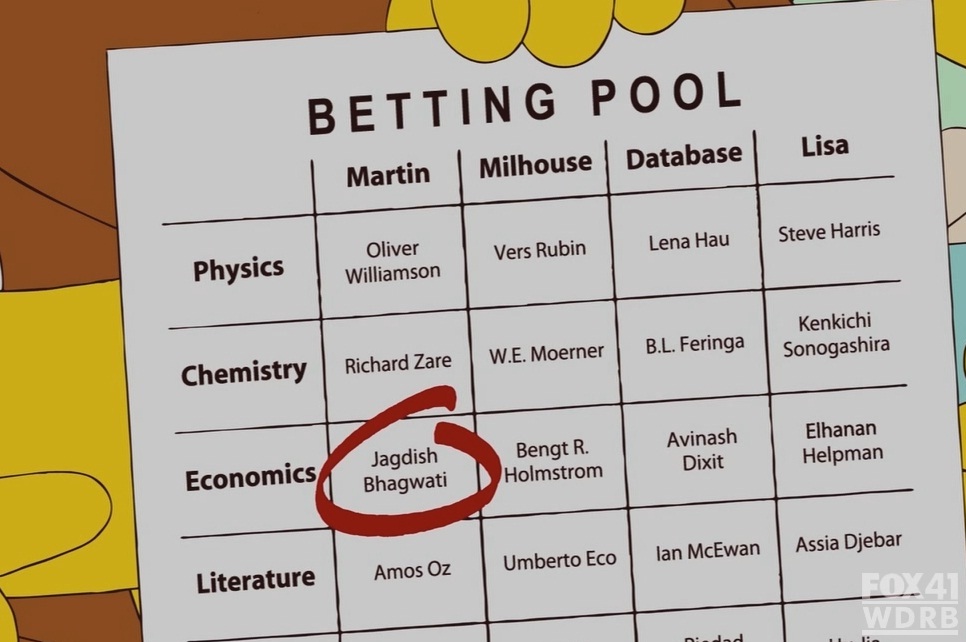 Betting on the Nobel 2010年10月9日 原文 Here. A few of my Harvard colleagues are supposedly in the running. Thanks to Tyler Cowen for the pointer. Also, by the way, here is a shot from a recent episode of The Simpsons, sent in by a reader: 所在分类:Uncategorized