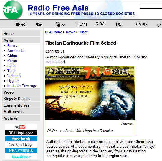 The film, titled “Hope in a Disaster” and produced by Buddhist monks, has proven popular with Tibetan viewers, but Chinese authorities have confiscated hundreds of DVD copies of the film from three shops in Jyekundo and from two shops in the nearby region of Kham Nangchen.
