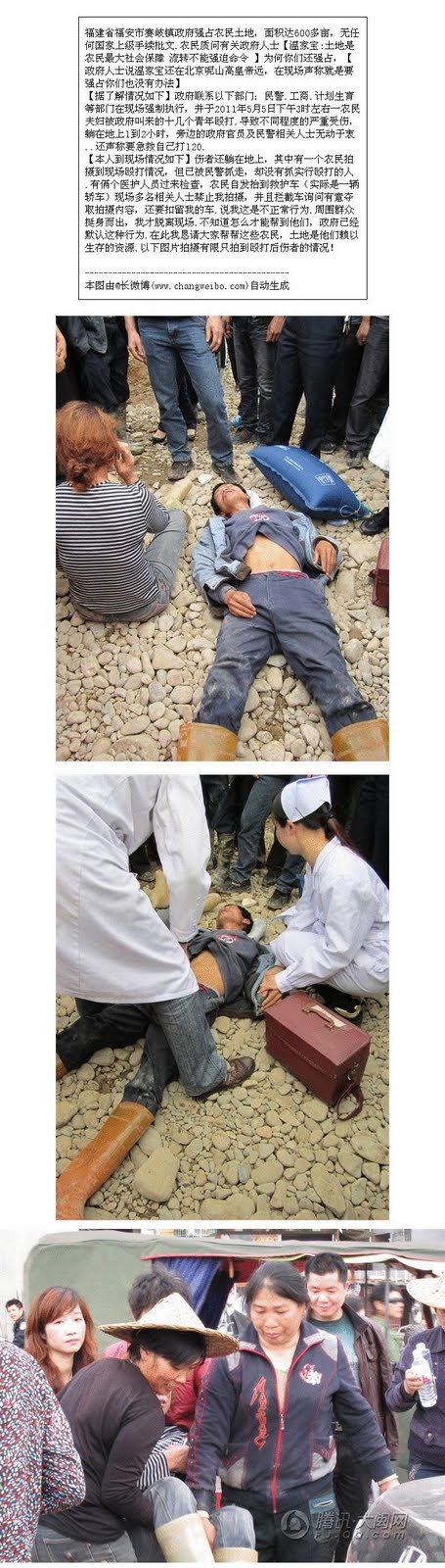 我在现场只拍到伤者躺在地上的图,就这样也被go-vern-ment部门的人拦截质问,意夺取..当地群众上前解围才得以脱身.据了解,当地新闻媒体无一个敢来报道此事件,直接被拒绝不敢来。昨晚已开始强制执行,土地被填埋,就这样不了了之了吗?今后他们生活来源靠什么?go-vern-ment也说了jiabao.wen在北京,山高皇帝远,就是要强占你们也没办法?谁来救救他们?