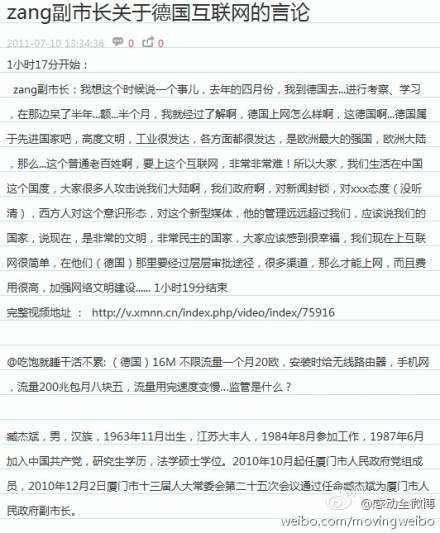 厦门副市长@臧杰斌 ,去年12月从北京调任,昨天在厦门市一个文明上网的交流会上爆出这样言论:德国老百姓要上网非常非常困难,要经过层层审批,而且费用很高,西方对意识形态管理、对新型媒体,管理远远超过我们,所以应该说我们国家是非常文明,非常民主的,大家应该感到幸福http://t.cn/a0MvGO