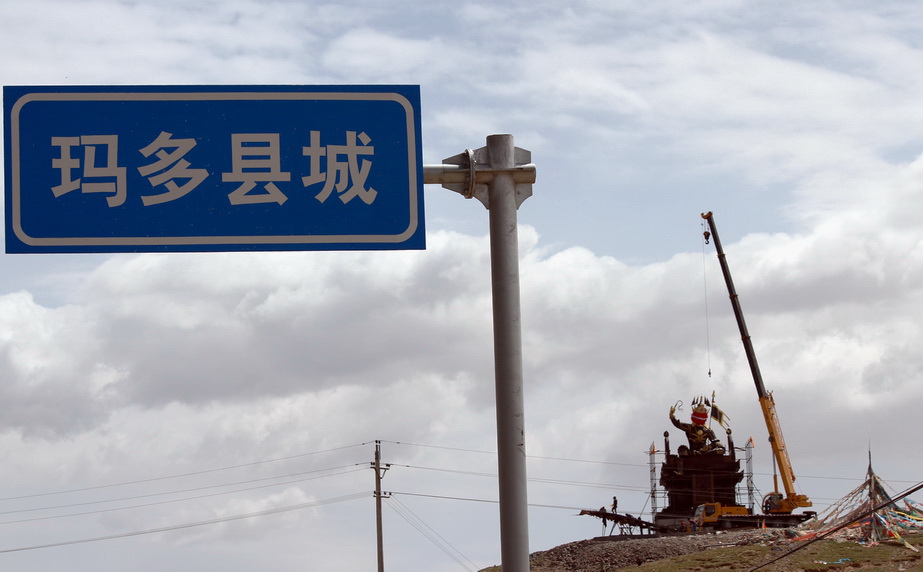 只有中文没有藏文的县城标识(玛多县属于今青海省果洛藏族自治州)。