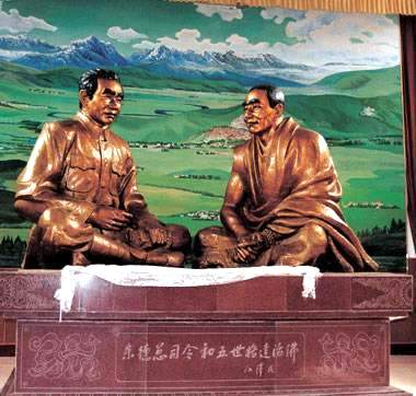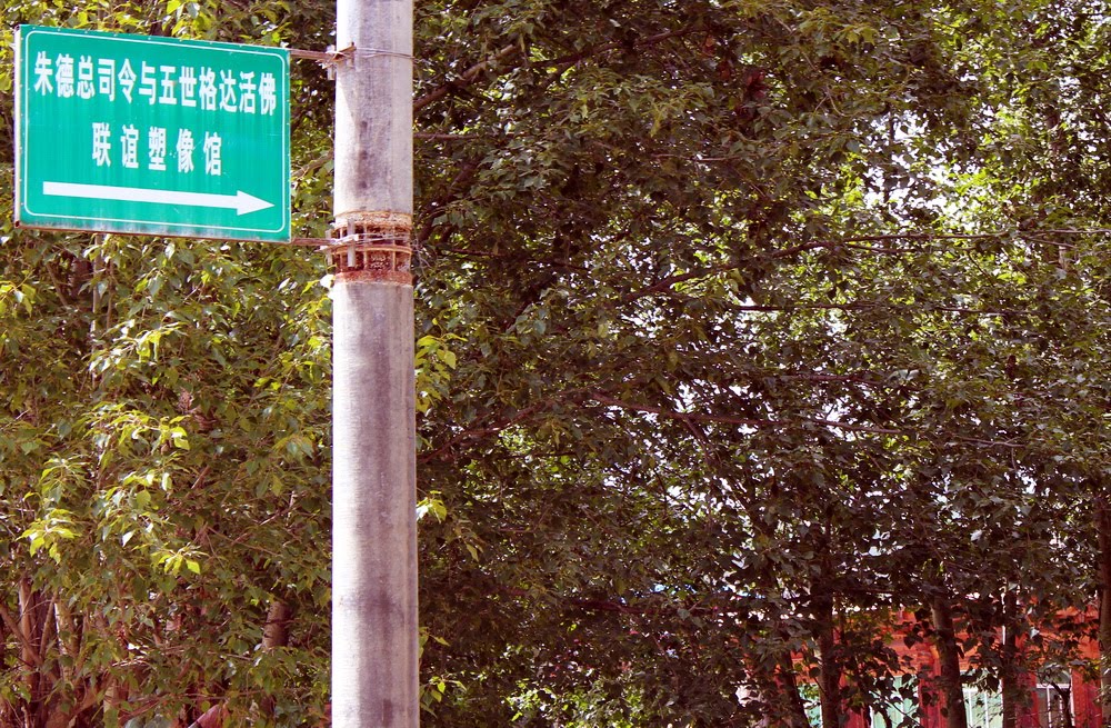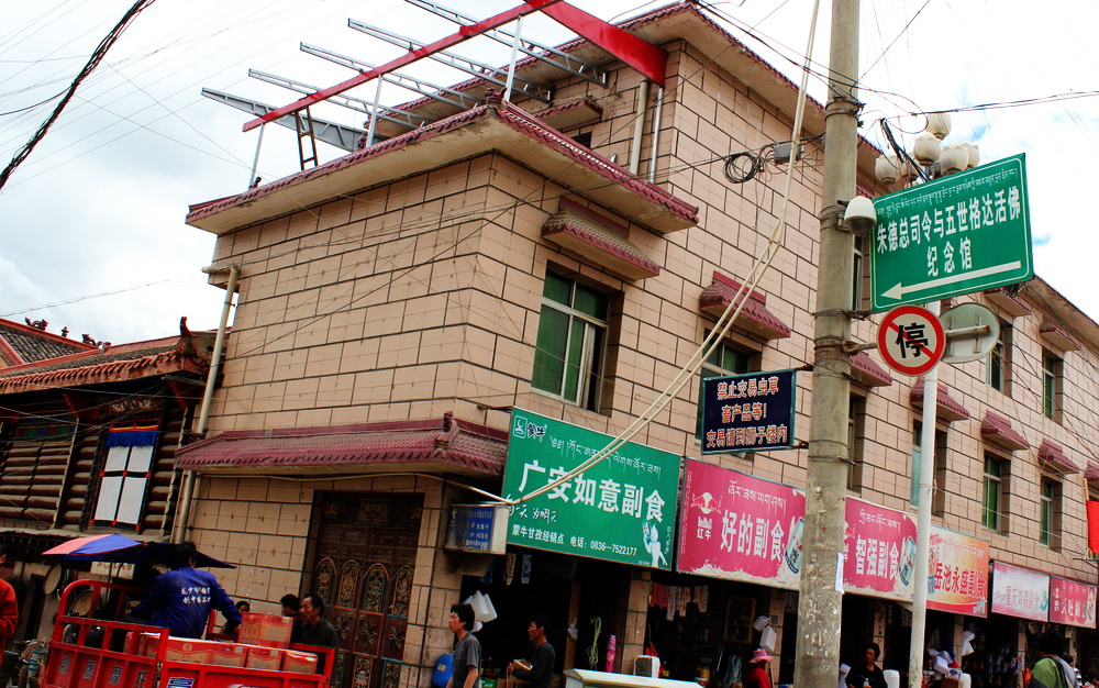 七月底到甘孜,蓦然注意到街边电杆上高挂一路牌,上书“朱德总司令与五世格达活佛纪念馆”。是最近修建的吗?顺着箭头走去,渐渐走出城外,找到的却是紧闭的红门后面一幢有着汉式风格的楼房,周遭树木葱茏、花草茂密,江泽民题写的馆名很是醒目。