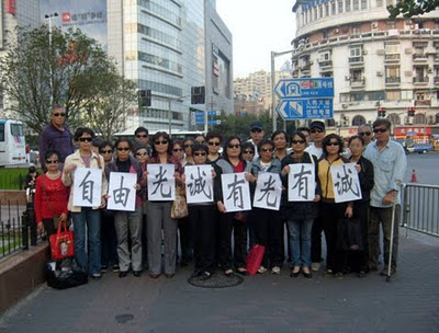 (2011-10-20)权利运动发布:(文/冯正虎)面对暴行,沉默就是帮凶。上海不会沉默,10月13日《东方早报》发布评论《陈光诚是谁?》,在中共十七届六中全会期间上海访民在北京永定门、在上海人民广场打出“自由光诚,有光有诚”的横幅。人人带上墨镜,我们都是光诚,同舟共济,冲破黑暗。