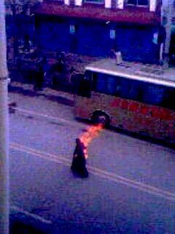不忍卒看的照片!惨不忍睹的照片!但为了见证,为了记忆,必须把这张 照片公诸于世:2001年10月17日,西藏安多阿坝(今四川省阿坝州阿坝县),20岁尼众丹增旺姆,在县城附近点火自焚牺牲。自焚时呼喊“让达赖喇嘛回到西藏”、“西藏自由”。