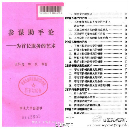 奇书共赏:《参谋助手论—-为首长服务的艺术》 2011年10月26日 来源:新浪微博 @十年砍柴:奇书《参谋助手论—-为首长服务的艺术》(西北大学出版社1994年出版王怀志 郭 政 著)。真是官场秘籍,他把许多秘书们参悟多年的经验,明确说出来。就看一段论述:不要在象征首长职务身份的小事上疏忽大意。 所在分类:网事纷呈