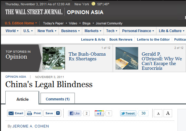 2011年11月3日,美国著名中国和东亚法律专家孔杰荣 (Jerome A. Cohen) 教授在华尔街日报发表他在美国国会听证会上的证词,题为《中国的法律失明 – China’s Legal Blindness》。