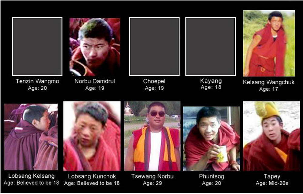 1、扎白:安多(今四川省阿坝藏族羌族自治州)阿坝县格尔登寺僧人,20岁。于2009年2月27日在阿坝县城点火自焚,并高举有西藏国旗和尊者达赖喇嘛的照片,遭中共军警枪击致残并被带走,至今不知下落,生死不明。