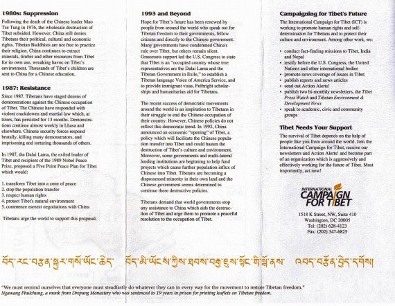 既然“国际声援西藏运动”似乎相信一个呼求让赞的博巴不应该得到诉求遭外界扭曲的待遇,既然“国际声援西藏运动”想让真相大白,我很乐意提供相关的材料来助阵。以下是“国际声援西藏运动”在一九九零年代中叶所印制的一份传单,其目的在向支持者以及捐款人说明博巴的感觉(我略去了印制捐款细节的那一页):