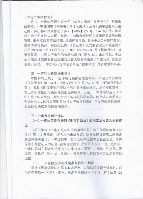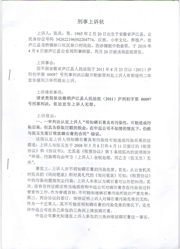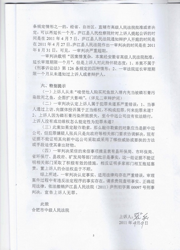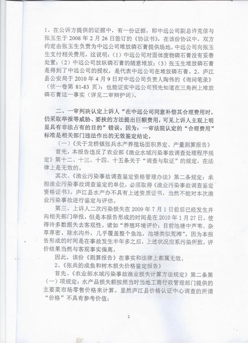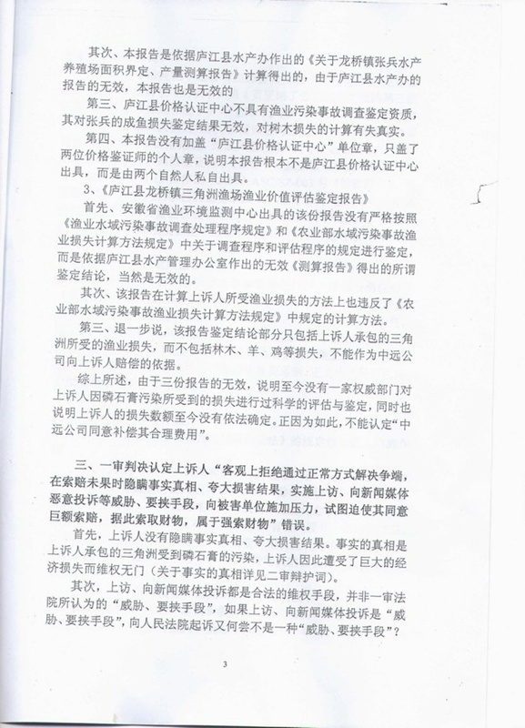 对公诉人指张兵“在新中远公司同意补偿其合理费用时,仍采取上访,向新闻媒体投诉等威胁、要挟的方法提出巨额赔偿,可见上诉人主观上明显具有非法占有的目的”的观点,张兵及辩护律师称,上访、向新闻媒体投诉是公民的权利,不能成为“威胁、要挟”的方法,否则依法到法院起诉亦能成为“威胁、要挟”的方法,被追究“敲诈勒索罪”了,至于庐江县法院所采信的由庐江县水产办及庐江县价格认证中心出具的《关于龙桥镇张兵水产养殖面积界定、产量测算报告》、《张兵的成鱼和树木损失价格鉴定报告》因不具备国家农业部相关法规规定的资质而无法律效力。