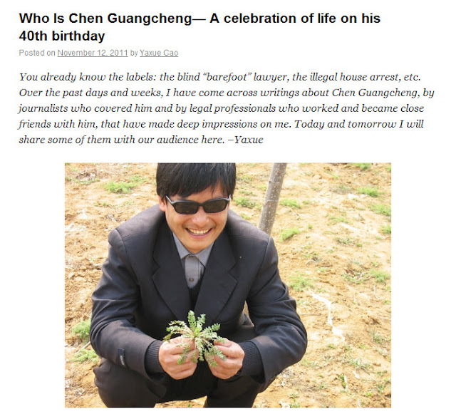 2011年11月12日是陈光诚40岁生日。《见识红色中国》网站刊登专栏作家、记者 Yaxue Cao 的英语博文,题为:Who Is Chen Guangcheng— A celebration of life on his 40th birthday