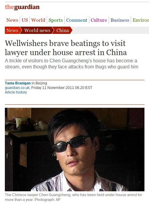 2011年11月11日,卫报英语报道,题为:在中国,祝福的人们冒着殴打的风险去看望被软禁的律师