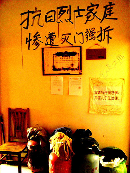 拆了半边的居民楼内只剩下十几户誓与房屋共存亡的芜湖纺织厂职工,抗日烈士后、70多岁的彭茂华老泪纵横的说:“我们的前辈们抛头颅洒热血就为的是让后人过上好日子,可是我们现在连自己的住房都保不住,两位老人每天守着5个煤气罐,墙上贴着烈士证,军属证,近日法院已给他们下达强拆公告,老人义愤地在墙上写下“抗日烈士家庭,惨遭灭门强拆”随时准备与上门强拆人员同归于尽。