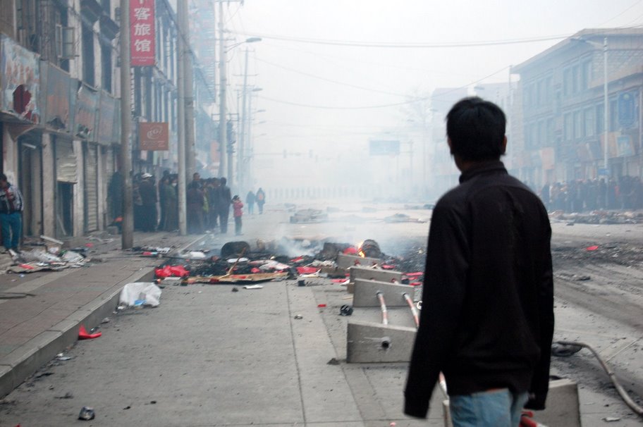 是的,看见了久已压抑的爆发很惊人,但绝不是CCTV所渲染的“打砸抢烧”,而是有几个小时,仿佛真的让赞(藏语,独立)了,兴奋的藏人们呼叫,奔走,发泄。好奇怪啊,平日里,一个人若举起手臂喊一声“让赞”,就会被蜂拥而上的便衣扑倒在地,可这么长时间,长达数小时,怎么会容许这么多的藏人这么强烈的爆发呢?不过他顾不得细想下去,他已经被男女声混合的“嘎嗨嗨”(一种纯藏式的呼啸,通常是藏人放牧时习惯的呼啸,在2008年西藏抗暴事件爆发时,被中国媒体形容为“狼嚎”)激动得真想冲下楼去,但他卧病多日,只能走到窗前,心儿狂跳地旁观。