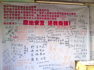 前几天郑新龙在自己家商铺内贴出一副3米见方的白布,几天时间就签满了群众的意见,每一个签名背后都是一部泣血控诉,反映出人民群众对地方政府的强拆行为已经到了深恶痛绝的地步。很多人留下电话,他们表示有很多话要说,他们中很多人被打、被关、被恐吓、被砸窗、被叮哨、被送精神病院。希望有良知的记者联系他们,揭露芜湖的黑暗拆迁!
