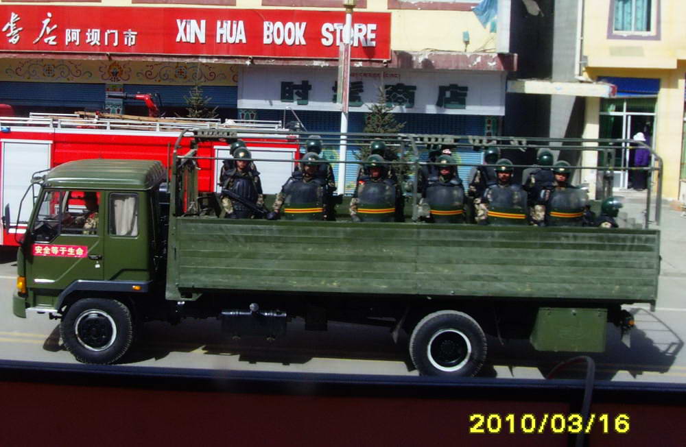 以下图片,来自阿坝,拍摄者是当地藏人,记录的是去年(2010年)3月16日的阿坝县城。荷枪实弹的军人站在行驶于阿坝县城的军车上,而军车上贴着“向阿坝县人民致敬”的鲜红标语。原来“致敬”是这样的,是以对准藏人的枪杆子来表示的。(图片为首发)