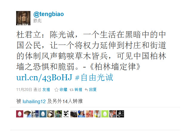 陈光诚,一个生活在黑暗中的中国公民,让一个将权力延伸到村庄和街道的体制风声鹤唳草木皆兵,可见中国柏林墙之恐惧和脆弱。据说在船要沉之前,老鼠总会最先逃命;在天文数字的维稳暴力下,无远弗届的官吏们(裸官)和精英们纷纷携黑金出逃或送妻女移民。铁道部运输局局长张曙光为其国外的妻女在瑞士银行存款28亿美金,而它只能算是中国这艘破船上小老鼠。作为柏林墙在地球上的最后一块残垣断壁,中国注定也逃脱不了”柏林墙定律”;因为人心向善,人类世界不会永远容许一个不正义的利益集团继续做恶;否则,那将是人类的耻辱。