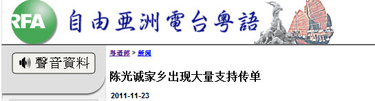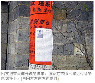 山东失明维权人士陈光诚的近况仍受关注,各界声援行动一浪接一浪,继组团探访祝贺他生日后,东师古村邻近一带,近日出现大批支持陈光诚的传单。(姬励思报道)