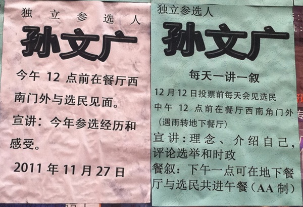 维权网 | 孙文广在山东大学为竞选宣传(图) 2011年11月30日 原文 (维权网信息员孙小芸报道)11月26日星期六上午9点30分,孙文广教授到山东大学为自己竞选人大代表举行公民权利宣传海报张贴活动。 山东大学教授孙文广教授再次竞选人大代表资格,并到山东大学张贴宣传海报,维权人士孙万宝等人到现场帮助宣传,宣传活动中有很多学生围观,也有老师拍照留念。 整个宣传活动一直有国保监控,随着驻足围观的人数增多,国保把横幅等宣传资料抢夺撕掉。 本文由自动聚合程序取自网络,内容和观点不代表数字时代立场 定期获得翻墙信息?请电邮订阅数字时代 所在分类:Uncategorized标签:国保,孙文广,维权,宣传,山东 相关文章 【CDT周报】第254期:大人们哭声多了,小孩的哭声就少了 【CDT月度视频】十二月之声(2025)——“请自觉放弃一切自由” 律侠普法|2025年圣诞节的感想:法律改动和氛围转变 【年终专题】“我当兵当错了,入党入错了”……2025年度视频 【404文库】网易|中纪委请注意:退休副省长被“管家”盗卖243万元名酒