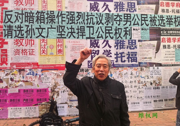 维权网 | 孙文广在山东大学为竞选宣传(图) 2011年11月30日 原文 (维权网信息员孙小芸报道)11月26日星期六上午9点30分,孙文广教授到山东大学为自己竞选人大代表举行公民权利宣传海报张贴活动。 山东大学教授孙文广教授再次竞选人大代表资格,并到山东大学张贴宣传海报,维权人士孙万宝等人到现场帮助宣传,宣传活动中有很多学生围观,也有老师拍照留念。 整个宣传活动一直有国保监控,随着驻足围观的人数增多,国保把横幅等宣传资料抢夺撕掉。 本文由自动聚合程序取自网络,内容和观点不代表数字时代立场 定期获得翻墙信息?请电邮订阅数字时代 所在分类:Uncategorized标签:维权,宣传,山东,国保,孙文广 相关文章 【CDT月度视频】十二月之声(2025)——“请自觉放弃一切自由” 律侠普法|2025年圣诞节的感想:法律改动和氛围转变 【年终专题】“我当兵当错了,入党入错了”……2025年度视频 【404文库】网易|中纪委请注意:退休副省长被“管家”盗卖243万元名酒 夫子张|全民考公,是现在最荒诞的事