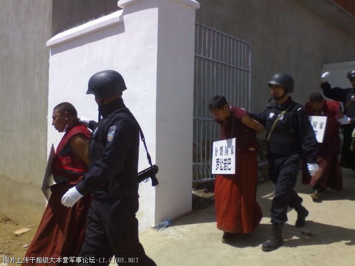 深感震惊的我反复看照片,认为这时间有可能是今年,也可能是2008年3月以后(牌子上写的“分裂国家”,“聚众冲击国家机关”等,今年被抓的藏人也是这些“罪名”);而地点,从寺院建筑和街道店名(不太清楚)来看,是安多阿坝(今四川省阿坝州阿坝县),已有九位藏人僧尼自焚的阿坝……