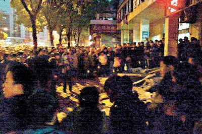 湖北省武汉市一间建设银行分行门口昨发生爆炸案,传有歹徒引爆放在银行门口的炸弹,由于爆炸威力强大,银行门口被炸出一个大坑,多人被炸至血肉模糊。其中一名 20岁妙龄女子,后脑被炸至开花惨死,目前已知爆炸至少造成 2死逾 10伤。案件正在调查中。