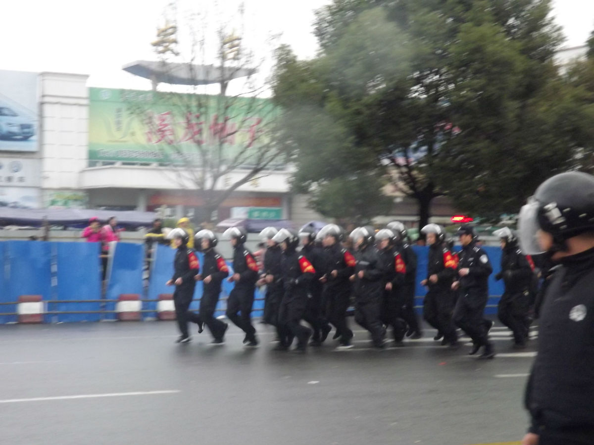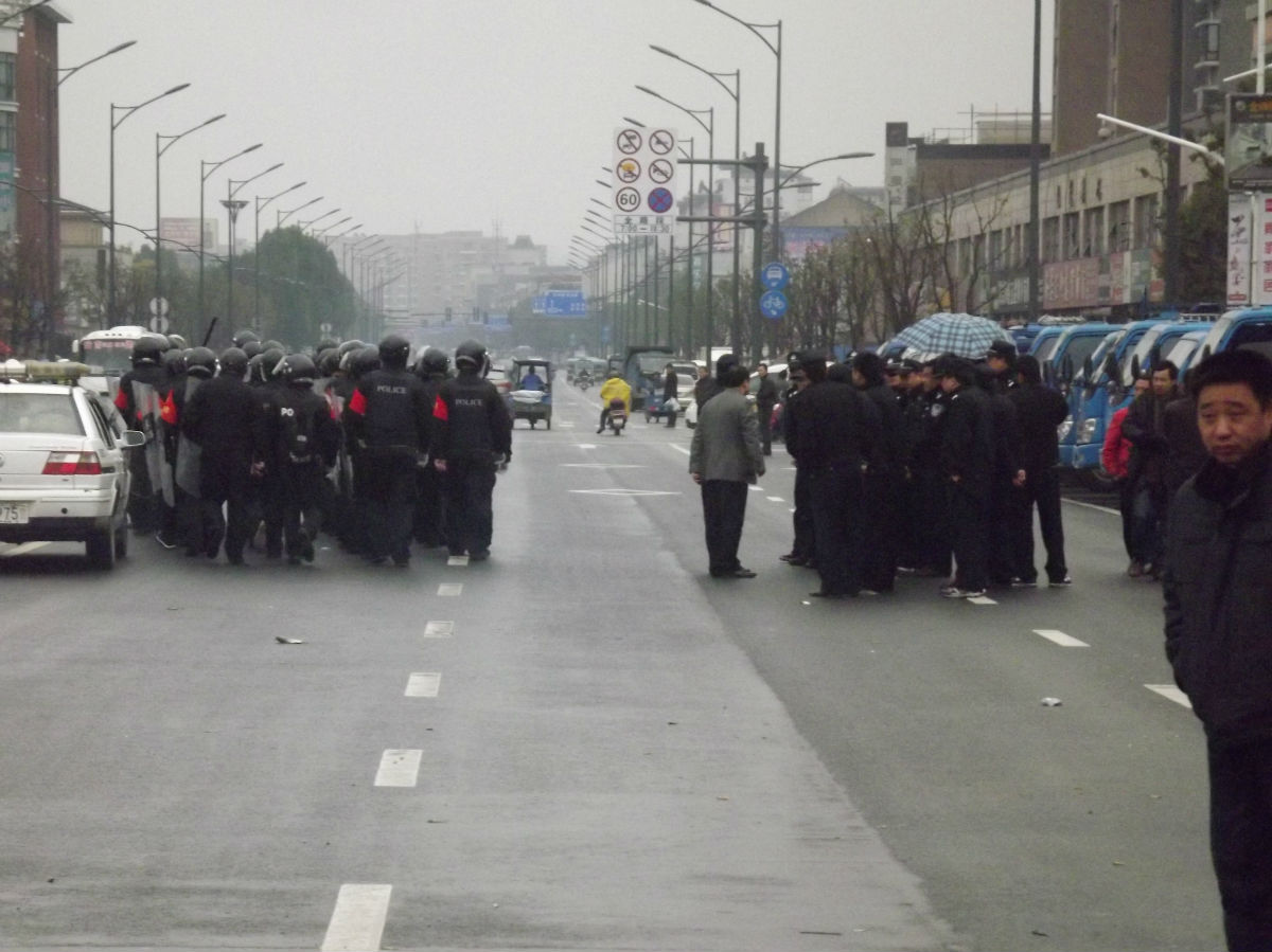 员工拿不到工资,纷纷从厂房出来拦车,造成交通堵塞。近千人沿着公路游行去具政府讨说法,在安吉车站附近被大批防暴警察拦着,多名工人被打伤。