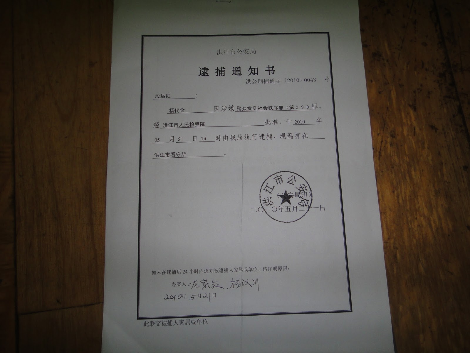 库区维权人士跟本网信息员说,补顺村8组村民杨代金的遭遇最具典型性。据库区维权人士讲述,太平乡政府工作人员曾先后十几次将安江电站建设协调指挥部自定的补偿款送到杨代金的手中,强迫杨代金签字同意,均遭杨代金拒绝。后来杨代金被洪江市公安局以涉嫌聚众扰乱社会秩序罪刑事拘留两个月,出来后,杨代金无奈之下收了乡干部送来的补偿款。维权人士还说,在抓捕杨代金的那天晚上,他的妻子身穿三角短裤被暴力执法人员从床上拖出来,仅穿的一点衣服还被撕破。