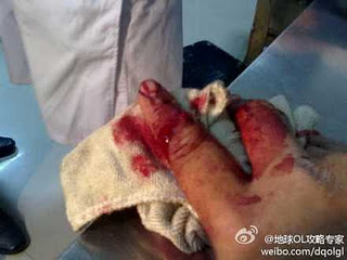 “地球OL攻略专家”8时04分的微博说:他是如厕时遭到警员闯入拍摄、袭击并抢夺手机,遭到暴徒侵害时因正当防卫而被砍伤手的。他说:“我虽负伤,却以一敌五获得全胜,使其猖狂而逃,丢盔弃甲!”