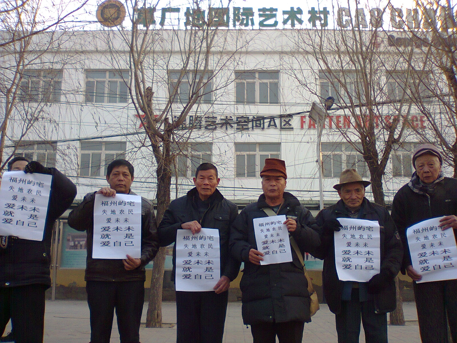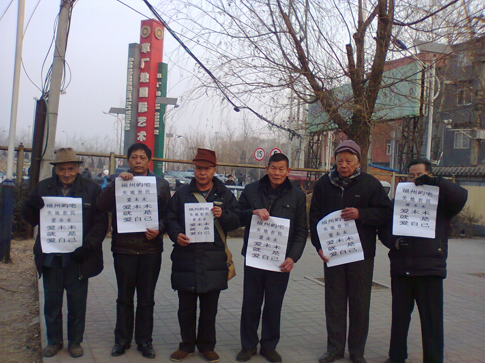 今天上午10点多钟,福州因土地被政府征占而上访的维权代表林应强等7人,其中有80高龄的维权代表,他们赶到北京上访,想顺便前往朝阳区草场地艾未未工作室拜访。当他们赶到草场地发棵258号时,发现前面停着警车,于是他们在周围观望了一会,借监视警察不注意时,他们在草场地前照像。维权代表们手举“福州屿宅失地农民爱未未,爱未未就是爱自己”的打印大字,表达了对艾未未的支持与自己维权跟艾未未的紧密关系。