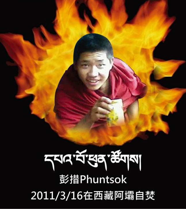2、洛桑平措:安多(今四川省阿坝藏族羌族自治州)阿坝县格尔登寺僧人,20岁。于2011年3月16日在阿坝县城点火自焚,呼喊“让达赖喇嘛回来”、“西藏需要自由”、“祈愿达赖喇嘛长久住世”等口号,遭中共军警毒打,次日凌晨牺牲。