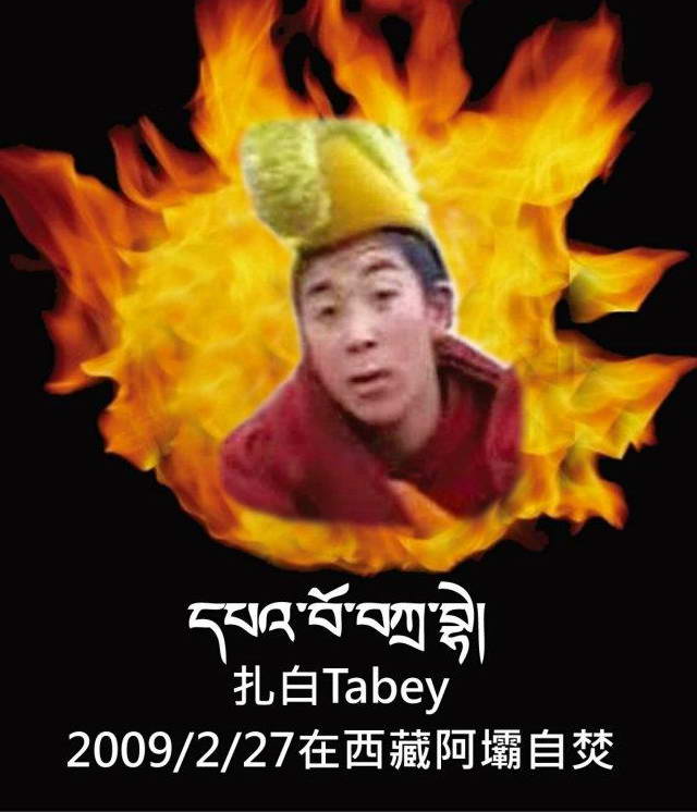 1、扎白:安多(今四川省阿坝藏族羌族自治州)阿坝县格尔登寺僧人,20岁。于2009年2月27日在阿坝县城点火自焚,并高举有西藏国旗和尊者达赖喇嘛的照片,遭中共军警枪击致残并被带走,至今不知下落,生死不明。