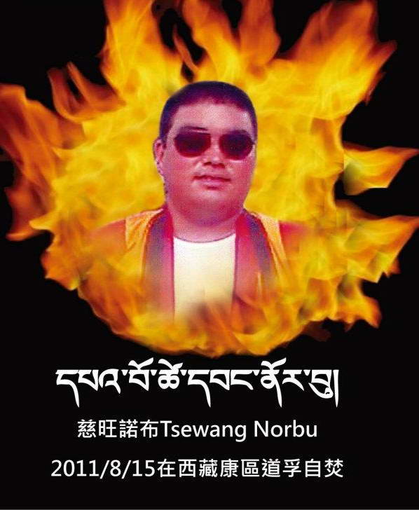 3、次旺诺布:康区(今四川省甘孜藏族自治州)道孚县灵雀寺僧人,29岁。于2011年8月15日在道孚县城点火自焚,呼喊“祈愿达赖喇嘛长久住世”、”西藏独立“等口号,当场牺牲。