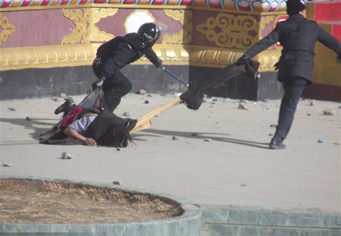 让我们来分析这些现场照片。从照片上可见遭毒打的藏人手无寸铁,一人穿藏装,一人未穿藏装。