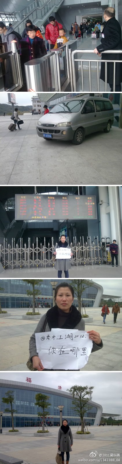 今天(2012年2月11日星期六),吴华英到福清动车站迎接来围观“福清纪委爆炸案”真相的吴斌。发现动车站门口布满警察便衣,在进站口处停着一辆闽O A0506警车。中午1:48分到站的乘客都走光了,吴华英仍不见吴斌,连续拨打吴斌电话也未接(电话:15167233712)。
