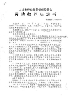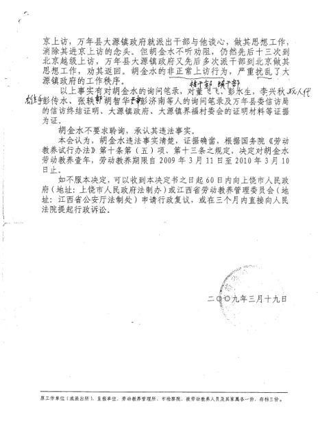 (维权网信息员夏飞石报道)江西万年县胡金水因上访遭政府多方打压,于2009年3月11日至2010年3月10日,被江西省上饶市劳动教养委员会劳教一年。劳教的理由是:非正常上访,扰乱了万年县大源镇政府的工作秩序。