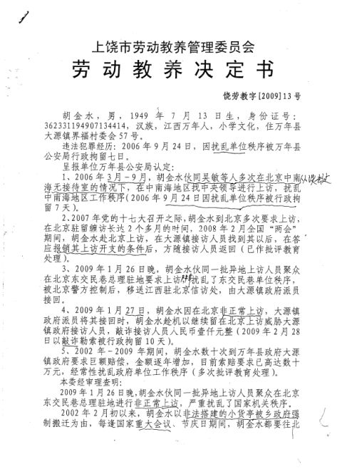 2009年2月28日,万年县公安以胡金水敲诈接访工作人员1000元人民币为名,将胡金水拘留10天。同年3月11日至2010年3月10日,江西省上饶市劳动教养委员会以胡金水经常非正常上访,向政府申请数十万人民币的巨额行政赔偿,扰乱了万年县大源镇政府的工作秩序为名,判处劳动教养一年。